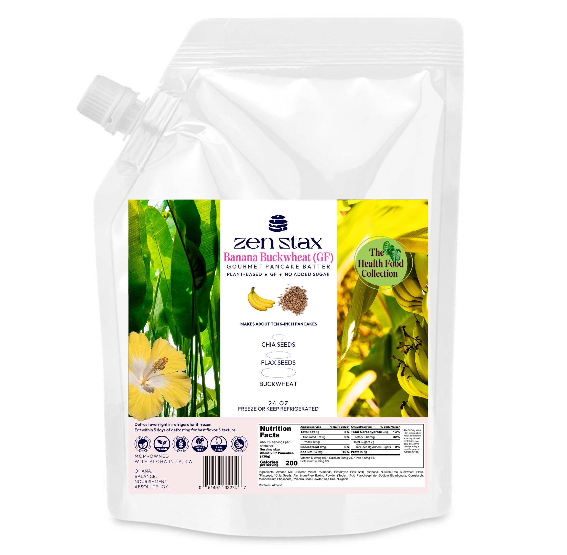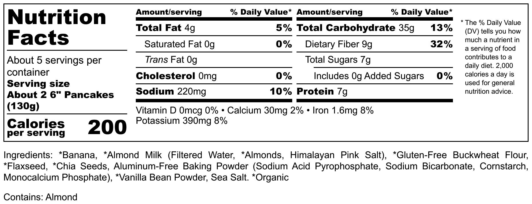 Ingredients: *BANANA, *MALK ALMOND MILK (FILTERED WATER, *ALMONDS, HIMALAYAN PINK SALT), *GLUTEN-FREE BUCKWHEAT FLOUR, *FLAXSEED, *CHIA SEEDS, ALUMINUM-FREE BAKING POWDER (SODIUM ACID PYROPHOSPHATE, SODIUM BICARBONATE, CORNSTARCH, MONOCALCIUM PHOSPHATE), *VANILLA BEAN POWDER, SEA SALT. *ORGANIC