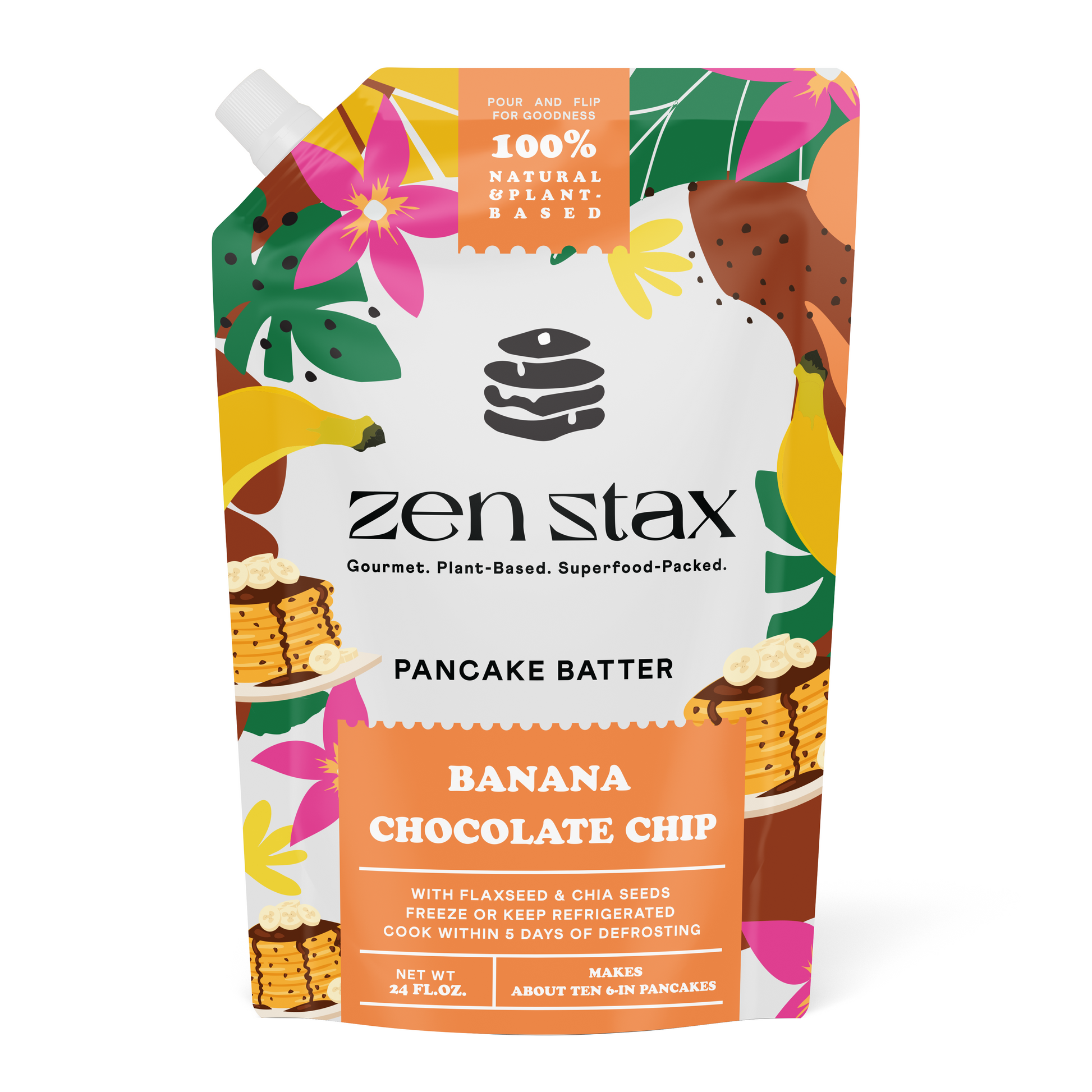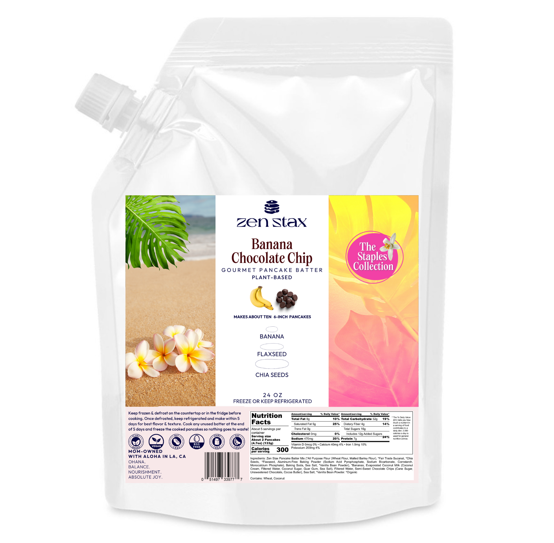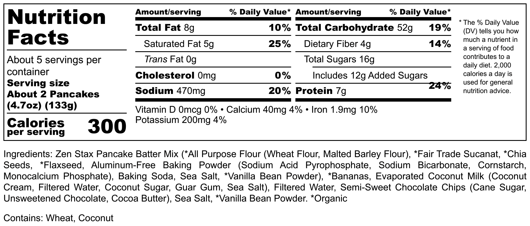 INGREDIENTS: ZEN STAX PANCAKE BATTER MIX (*ALL PURPOSE FLOUR (WHEAT FLOUR, MALTED BARLEY FLOUR), *FAIR TRADE SUCANAT, *CHIA SEEDS, *FLAXSEED, ALUMINUM-FREE BAKING POWDER (SODIUM ACID PYROPHOSPHATE, SODIUM BICARBONATE, CORNSTARCH, MONOCALCIUM PHOSPHATE), *FAIR-TRADE BANANAS, ENJOY LIFE SEMI-SWEET CHOCOLATE CHIPS (CANE SUGAR, UNSWEETENED CHOCOLATE, COCOA BUTTER) BAKING SODA, CELTIC SALT, *VANILLA BEAN POWDER), FILTERED WATER, EVAPORATED COCONUT MILK (COCONUT CREAM, FILTERED WATER, COCONUT SUGAR, GUAR GUM, SEA SALT), *ORGANIC