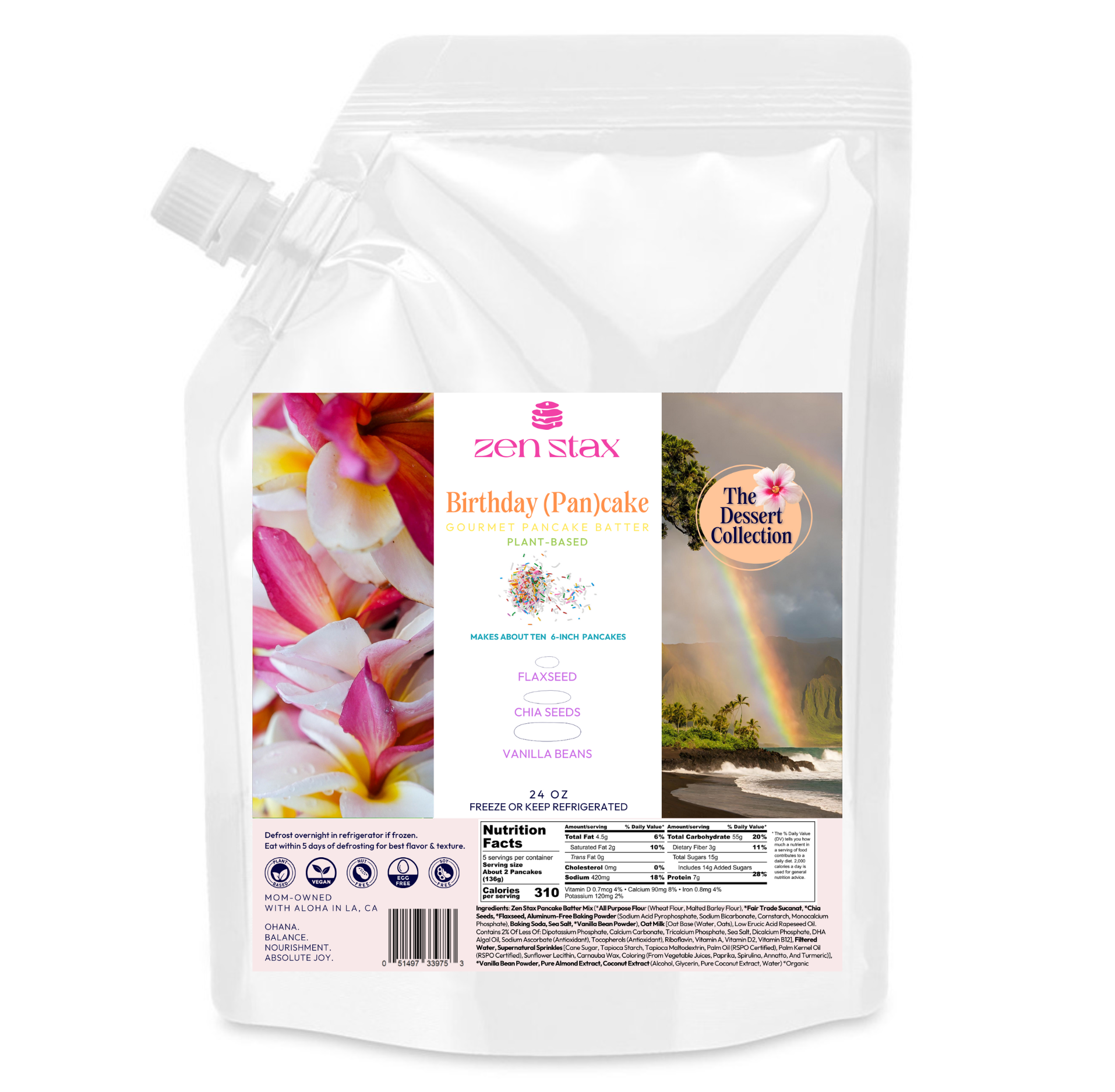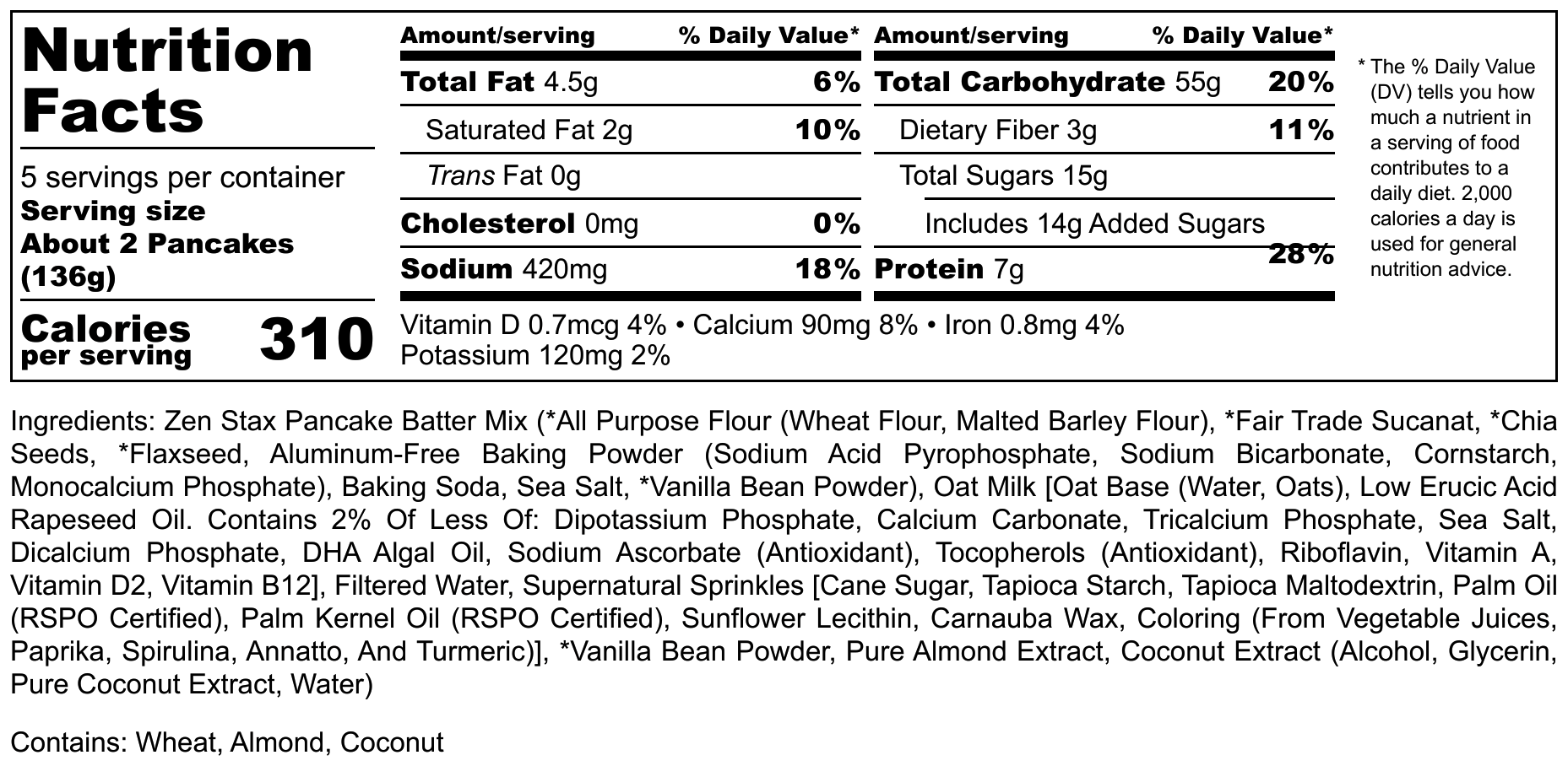 Ingredients: ZEN STAX PANCAKE BATTER MIX (*ALL PURPOSE FLOUR (WHEAT FLOUR, MALTED BARLEY FLOUR), *FAIR TRADE SUCANAT, *CHIA SEEDS, *FLAXSEED, ALUMINUM-FREE BAKING POWDER (SODIUM ACID PYROPHOSPHATE, SODIUM BICARBONATE, CORNSTARCH, MONOCALCIUM PHOSPHATE), BAKING SODA, CELTIC SALT, *VANILLA BEAN POWDER), FULL FAT OATLY [OAT BASE (WATER, OATS), LOW ERUCIC ACID RAPESEED OIL. CONTAINS 2% OF LESS OF: DIPOTASSIUM PHOSPHATE, CALCIUM CARBONATE, TRICALCIUM PHOSPHATE, SEA SALT, DICALCIUM PHOSPHATE, DHA ALGAL OIL, SODIUM ASCORBATE (ANTIOXIDANT), TOCOPHEROLS (ANTIOXIDANT), RIBOFLAVIN, VITAMIN A, VITAMIN D2, VITAMIN B12], FILTERED WATER, SUPERNATURAL SPRINKLES [CANE SUGAR, TAPIOCA STARCH, TAPIOCA MALTODEXTRIN, PALM OIL (RSPO CERTIFIED), PALM KERNEL OIL (RSPO CERTIFIED), SUNFLOWER LECITHIN, CARNAUBA WAX, COLORING (FROM VEGETABLE JUICES, PAPRIKA, SPIRULINA, ANNATTO, AND TURMERIC)], *VANILLA BEAN POWDER, PURE ALMOND EXTRACT, COCONUT EXTRACT (ALCOHOL, GLYCERIN, PURE COCONUT EXTRACT, WATER). *ORGANIC