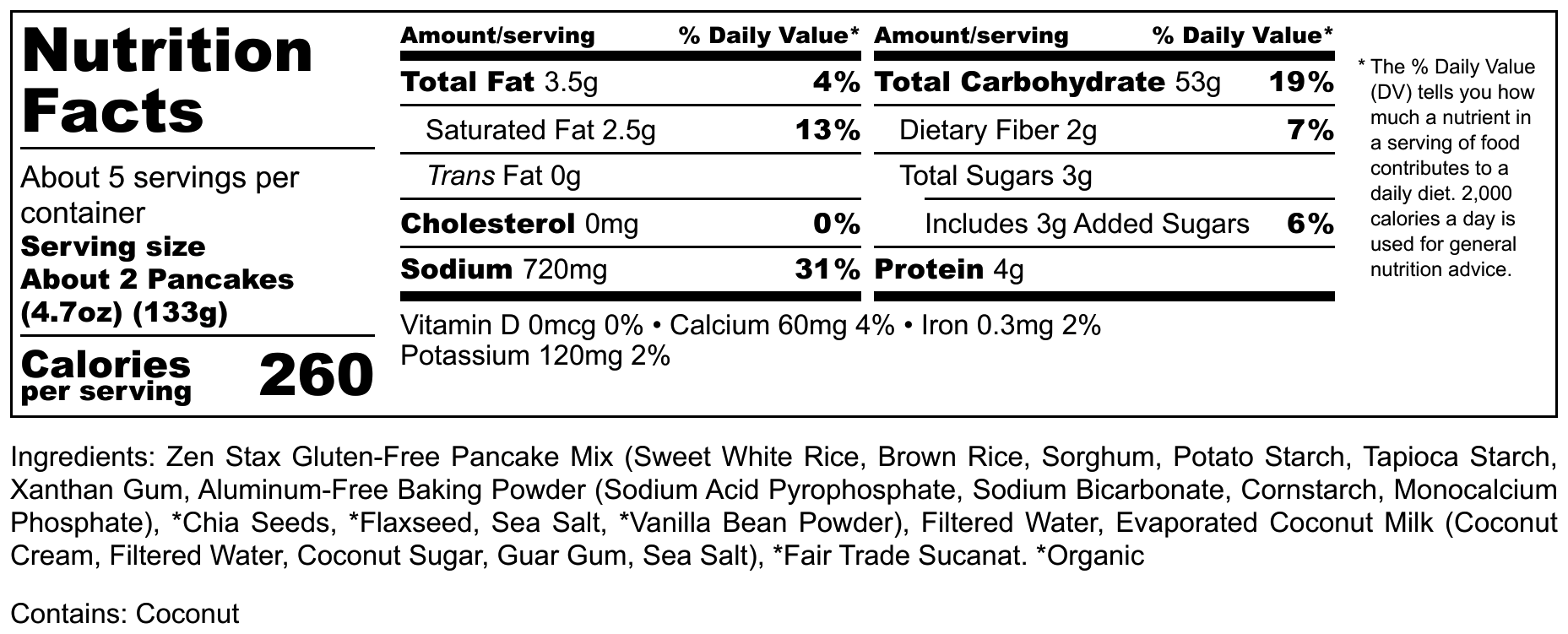 INGREDIENTS: ZEN STAX GLUTEN-FREE PANCAKE MIX (BOB'S RED MILL GLUTEN-FREE 1:1 ALL PURPOSE BAKING FLOUR (SWEET WHITE RICE, BROWN RICE, SORGHUM, POTATO STARCH, TAPIOCA STARCH, XANTHAN GUM), ALUMINUM-FREE BAKING POWDER (SODIUM ACID PYROPHOSPHATE, SODIUM BICARBONATE, CORNSTARCH, MONOCALCIUM PHOSPHATE), *CHIA SEEDS, *FLAXSEED, CELTIC SALT, *VANILLA BEAN POWDER), FILTERED WATER, EVAPORATED COCONUT MILK (COCONUT CREAM, FILTERED WATER, COCONUT SUGAR, GUAR GUM, SEA SALT), *FAIR TRADE SUCANAT. *ORGANIC