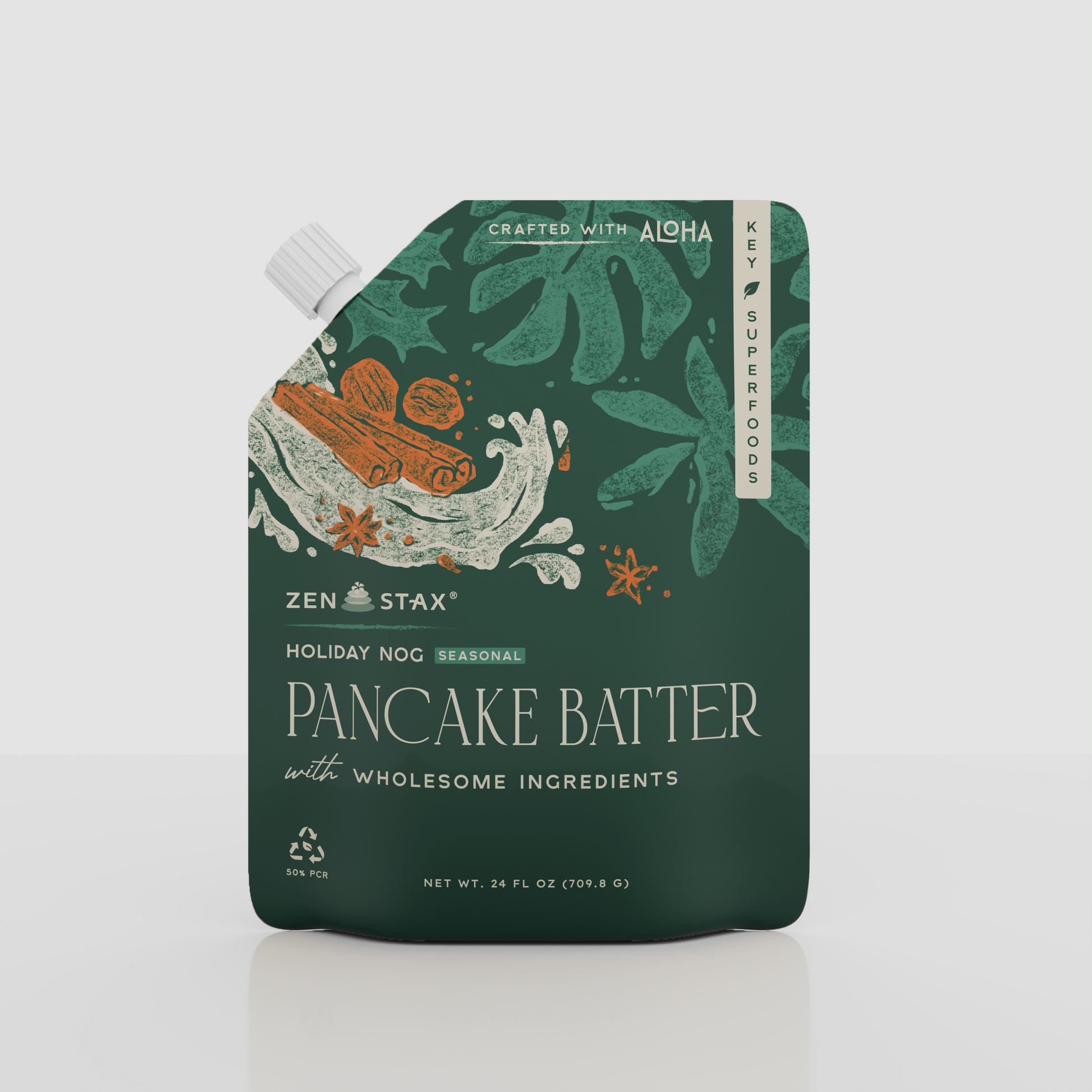 INGREDIENTS: Holiday Nog (Filtered Water, Coconut Cream), Cane Sugar, Sea Salt, Guar Gum, Nutmeg, Natural Flavor, Xanthan Gum, Annatto Extract (Color Added), Zen Stax Pancake Batter Mix (*All Purpose Flour (Wheat Flour, Malted Barley Flour), *Fair Trade Sucanat, *Chia Seeds, *Flaxseed, Aluminum-Free Baking Powder (Sodium Acid Pyrophosphate, Sodium Bicarbonate, Cornstarch, Monocalcium Phosphate), Baking Soda, Celtic Salt, *Vanilla Bean Powder), Filtered Water, *Vanilla Bean Powder, *Nutmeg. *Organic