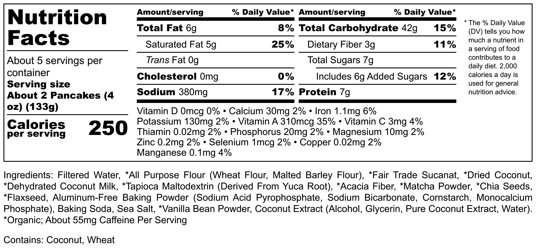INGREDIENTS: FILTERED WATER, *ALL PURPOSE FLOUR (WHEAT FLOUR, MALTED BARLEY FLOUR), *FAIR TRADE SUCANAT, *DRIED COCONUT, *COCONUT MILK POWDER (*DEHYDRATED COCONUT MILK, *TAPIOCA MALTODEXTRIN (DERIVED FROM YUCA ROOT), *ACACIA FIBER), *MATCHA POWDER, *FAIR TRADE SUCANAT, *CHIA SEEDS, *FLAXSEED, ALUMINUM-FREE BAKING POWDER (SODIUM ACID PYROPHOSPHATE, SODIUM BICARBONATE, CORNSTARCH, MONOCALCIUM PHOSPHATE), BAKING SODA, SEA SALT, *VANILLA BEAN POWDER, COCONUT EXTRACT (ALCOHOL, GLYCERIN, PURE COCONUT EXTRACT, WATER). *ORGANIC;