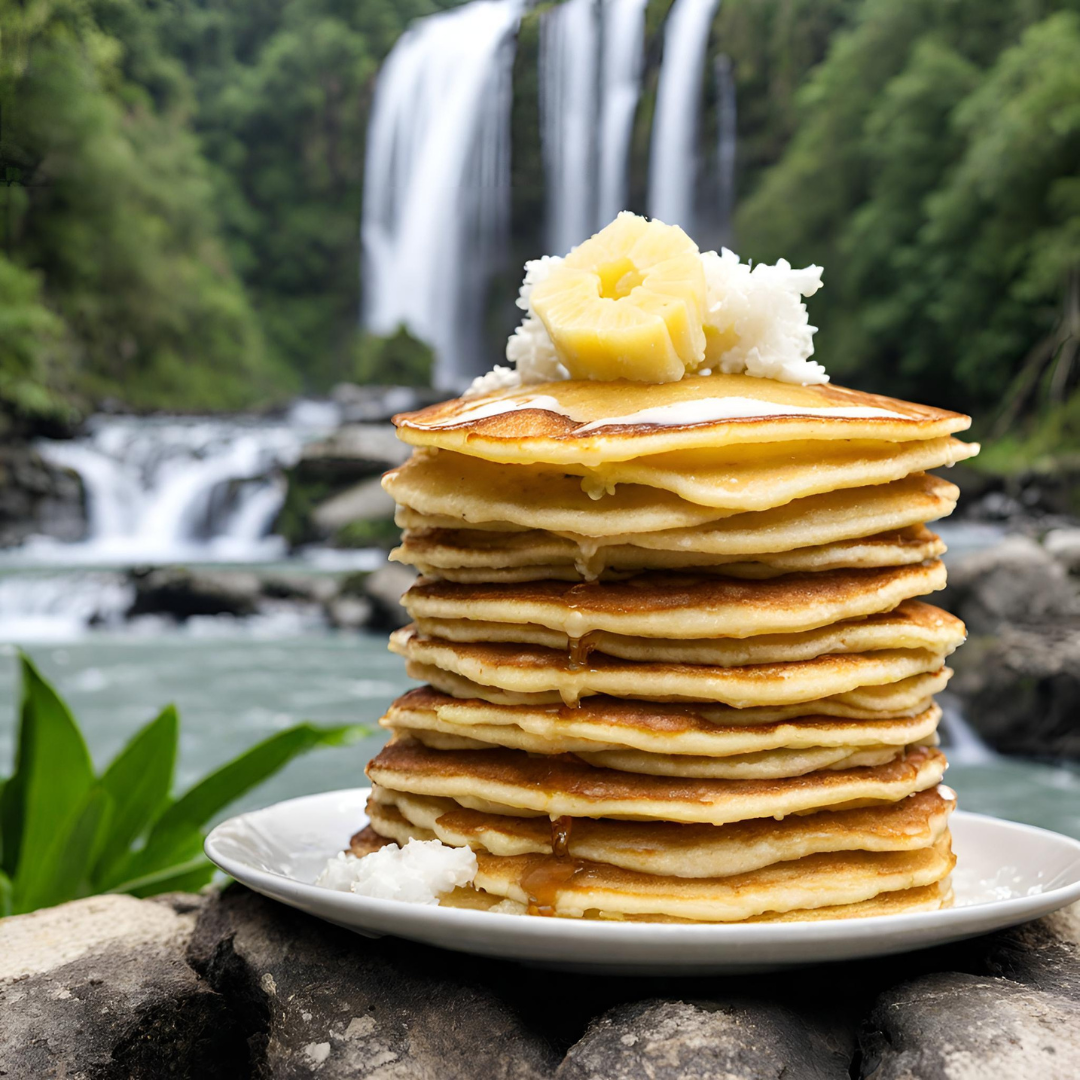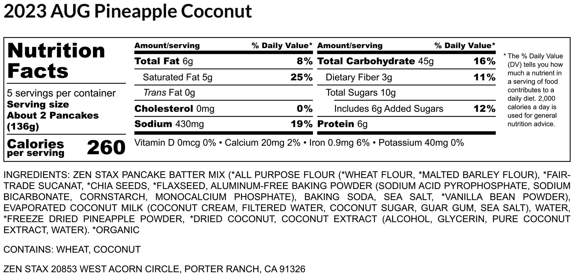 Ingredients: EVAPORATED COCONUT MILK (COCONUT CREAM, FILTERED WATER, COCONUT SUGAR, GUAR GUM, SEA SALT), ZEN STAX PANCAKE BATTER MIX (*ALL PURPOSE FLOUR (WHEAT FLOUR, MALTED BARLEY FLOUR), *FAIR TRADE SUCANAT, *CHIA SEEDS, *FLAXSEED, ALUMINUM-FREE BAKING POWDER (SODIUM ACID PYROPHOSPHATE, SODIUM BICARBONATE, CORNSTARCH, MONOCALCIUM PHOSPHATE), BAKING SODA, CELTIC SALT, *VANILLA BEAN POWDER), *FREEZE-DRIED PINEAPPLE POWDER, DRIED COCONUT, FILTERED WATER, COCONUT EXTRACT (ALCOHOL, GLYCERIN, PURE COCONUT EXTRACT, WATER). *ORGANIC